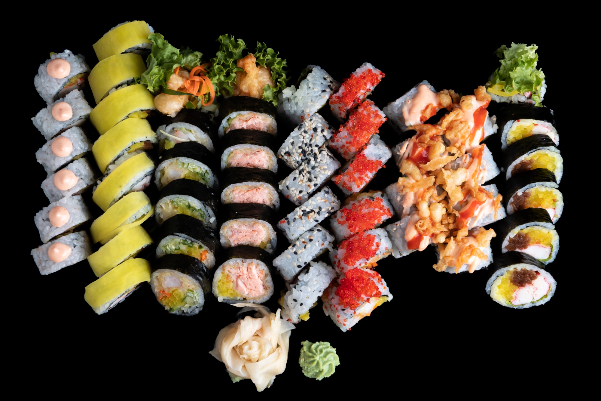 Łosoś, krewetka ebi, rzodkiew, tempura, sos mayo